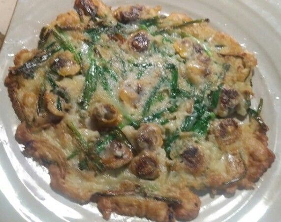 [재료] 완벽하게 해감하고 삶아 껍질을 깐 꼬막 200g, 부침가루 1컵, 물 1컵, 달걀 1개, 쪽파 5줄, 청양고추 1개, 홍고추 1개, 식용유.