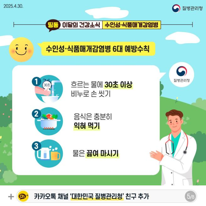 수인성 질병은 기본적인 위생 수칙만 잘 지켜도 충분히 예방할 수 있습니다. 특히 여름철과 폭우 뒤에는 더욱 철저히 지켜야 합니다.