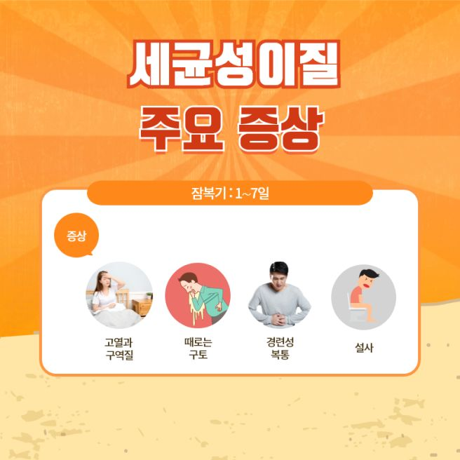 - 증상: 1~7일의 잠복기 후 발열, 심한 복통, 구토, 그리고 점액성 또는 혈액이 섞인 설사가 나타납니다. 잦은 배변감에도 불구하고 변이 잘 나오지 않는 후증(裏急後重)이 특징입니다.