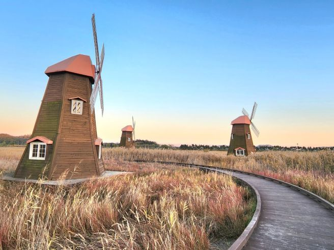 | 2단계: 풍차 포토존 (하이라이트) | 약 15~20분 정도 걸으면 붉은 풍차 3기가 있는 광장에 도착합니다. 이곳이 바로 인스타그램 인생샷 성지입니다. | 풍차를 갈대밭 속에서 바라보며 찍는 역광 사진을 시도해보세요. |