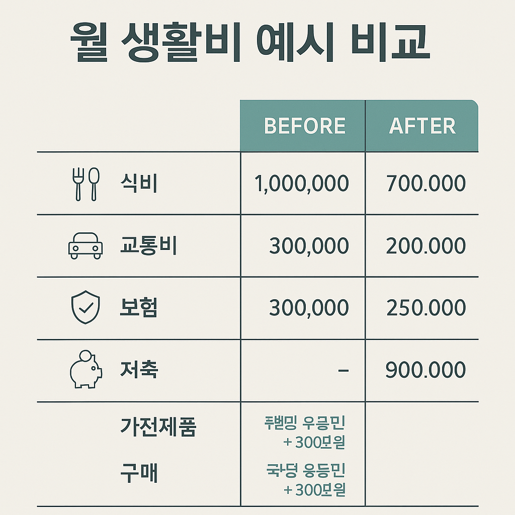 - 통신비: 가족 전체 요금제를 재조정하여 30% 이상 절약.