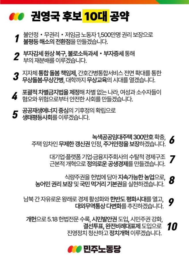 (참고: 아래 내용은 권영국 후보의 21대 대선 공약을 바탕으로 작성되었으며, 2025년 대선에서는 일부 수정 또는 추가될 수 있습니다.)