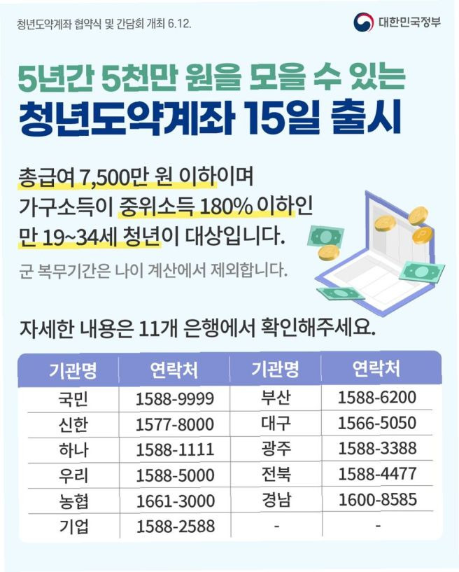 - **피싱 사기 주의:** 청년도약계좌를 사칭한 보이스 피싱이나 스미싱 사기에 주의하십시오. 정부 기관이나 은행은 계좌 개설을 위해 개인의 금융 정보를 전화나 문자로 직접 요구하지 않습니다.