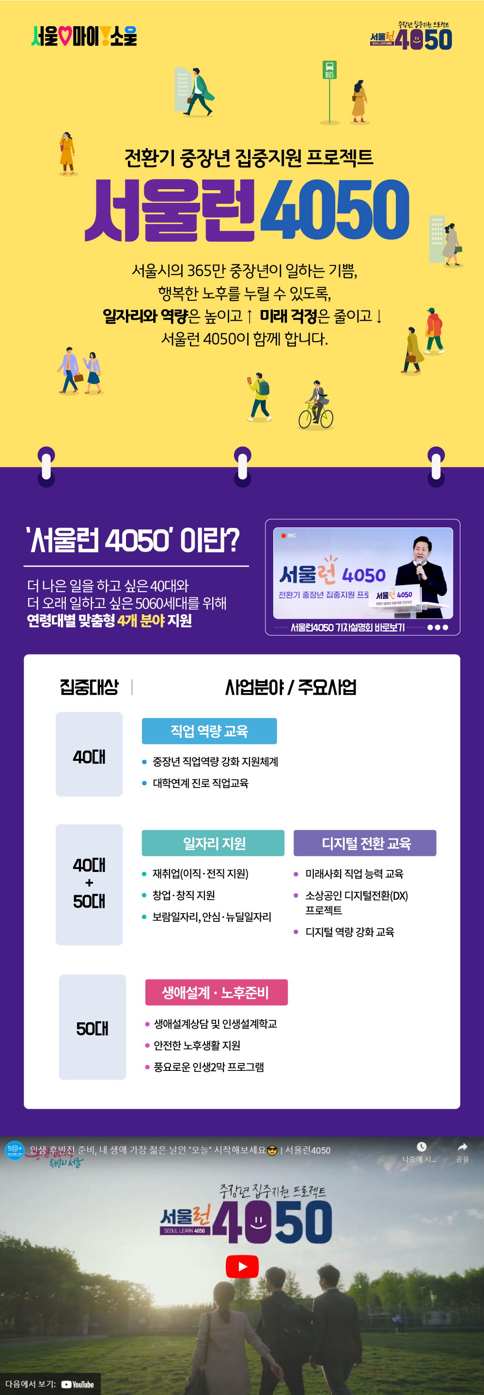 - 서울시 평생학습포털 ‘서울런 4050’ : 서울시에 거주하는 40~50대 중장년층을 위한 온라인 학습 플랫폼으로, 디지털 역량 강화, 직무 전환 교육 등 다양한 콘텐츠를 제공합니다. 기술 혁신과 디지털 시대에 적응할 수 있도록 지원합니다.